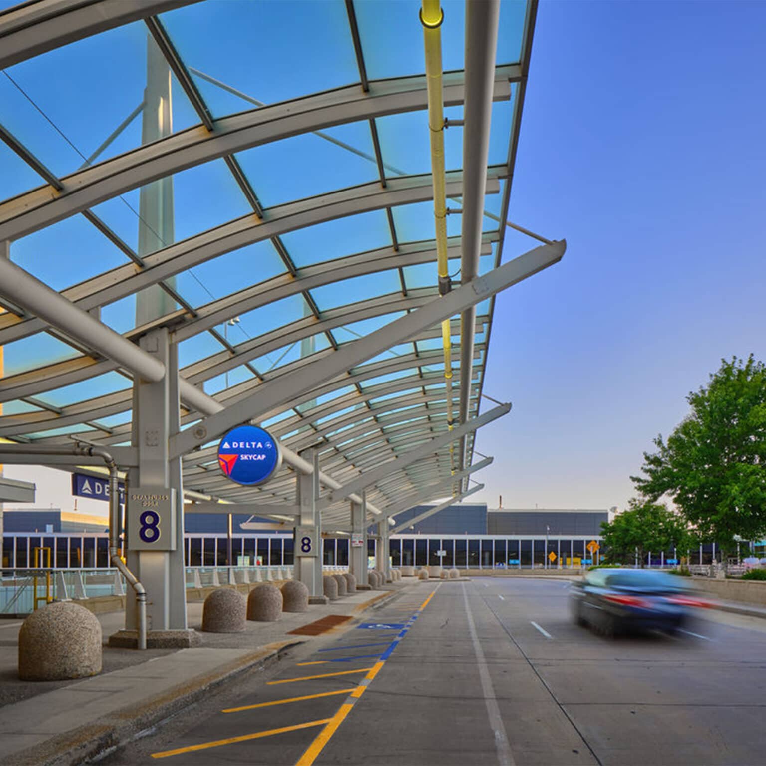 Curbside medallions identify accessibility access points and the airline check-in counter closest to a given entrance, so passengers don’t have to carry their luggage further than necessary.
